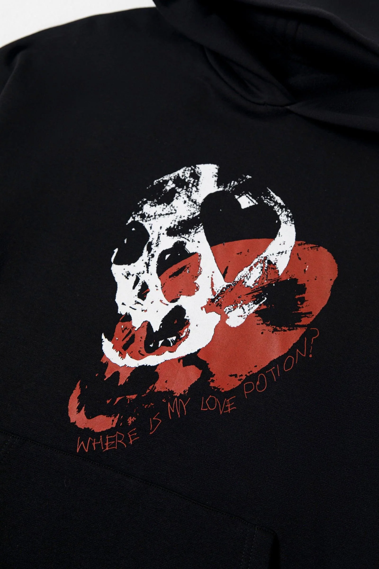 The love potion hoodie is another piece in the collection designed by Alyan Tareen. the hoodie features 90's inspired screen printed elements on the front and back, with strong references to the despair of the human condition.