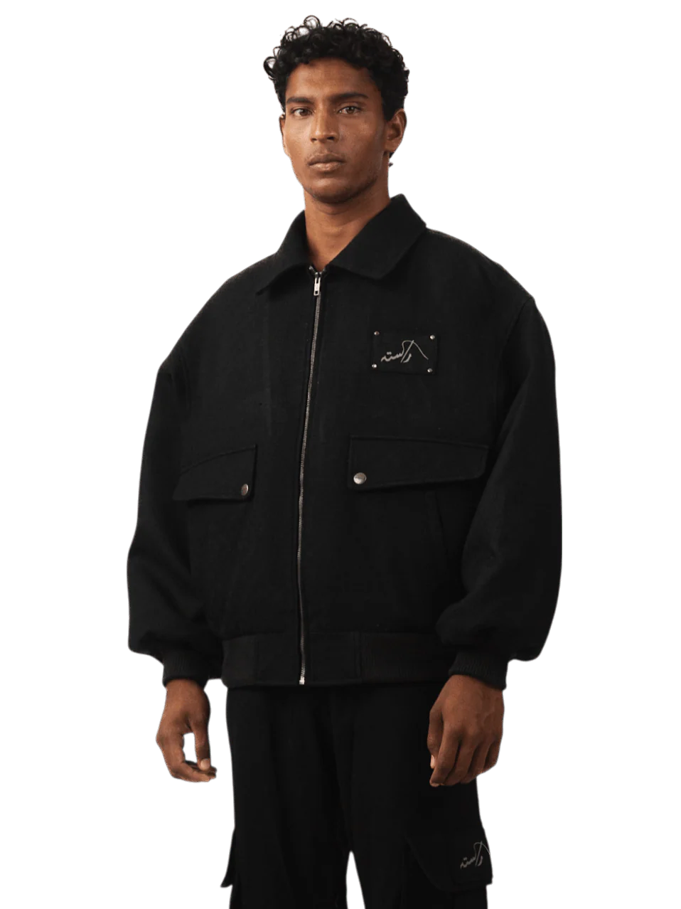A bold reinterpretation of the classic bomber, this all-black piece is crafted from textured denim fabric. Featuring oversized flap pockets, ribbed cuffs and hem, and a sturdy metal zipper, it’s built for both edge and function. The standout detail is the black-on-black screen print Urdu logo patch secured with visible rivets, adding a streetwear-meets-industrial feel. Perfect for layering and standing out in understated ways.