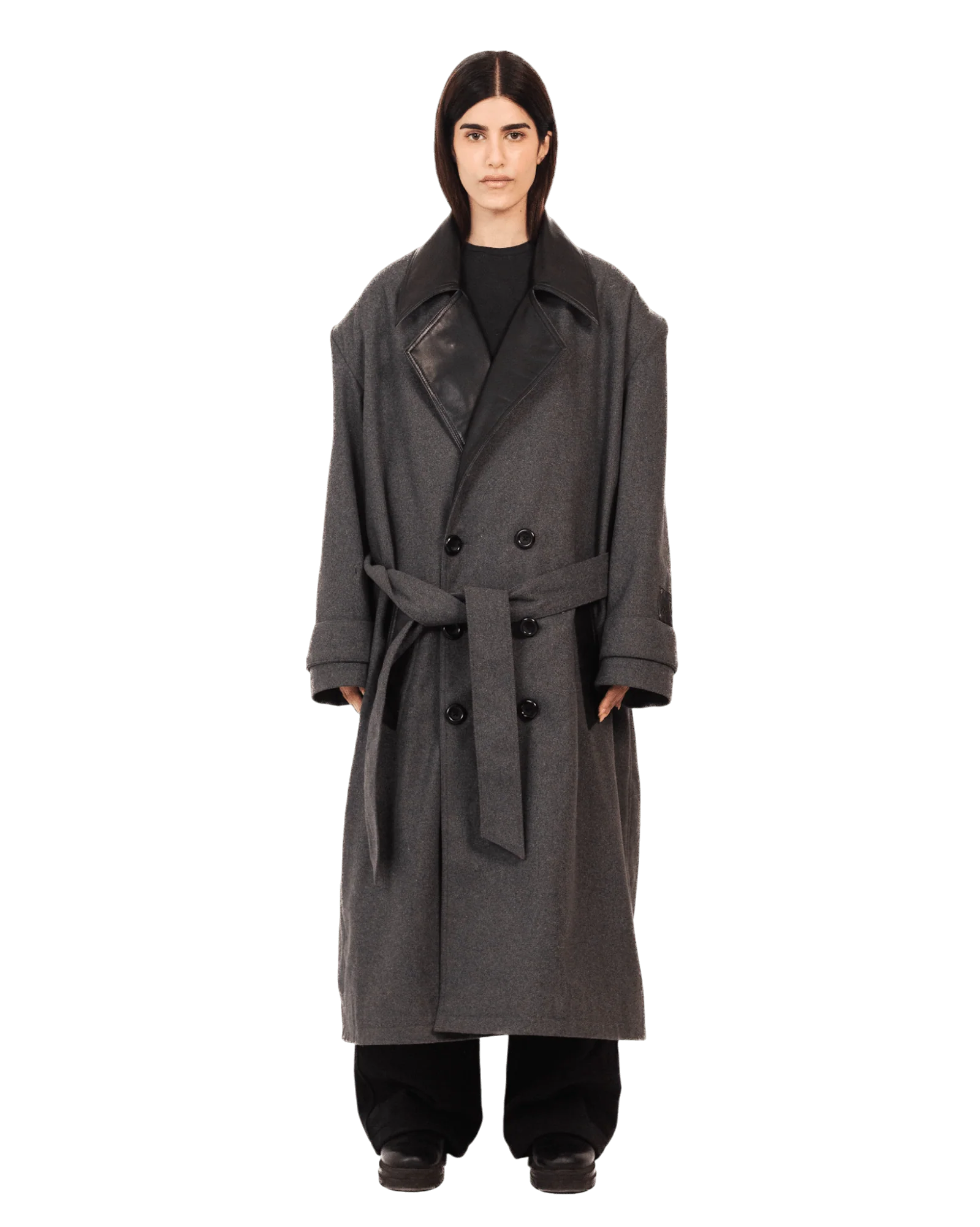 a sophisticated statement piece designed to redefine your winter wardrobe. Crafted with a premium wool blend and highlighted with sleek faux leather lapels, this trench coat is the perfect balance of classic tailoring and modern style. The oversized silhouette ensures comfort while exuding a bold and contemporary vibe. Complete with an adjustable belt, you can style it cinched at the waist for a structured look or wear it open for a relaxed, effortless aesthetic. Ideal for both formal events and casual layering, this trench coat guarantees warmth, style, and unparalleled functionality.
