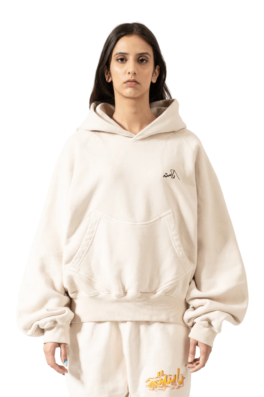 This Beige Hoodie presents a refined silhouette, introducing a new cropped, baggier fit with a curved pocket shape and raglan sleeves. The front showcases an Urdu Rastah logo emblem, while the back features the English logo and "Made in Pakistan" inscription in Urdu typography. Crafted from a robust 500 GSM, 100% cotton blend, this hoodie ensures both durability and comfort in its oversized design.