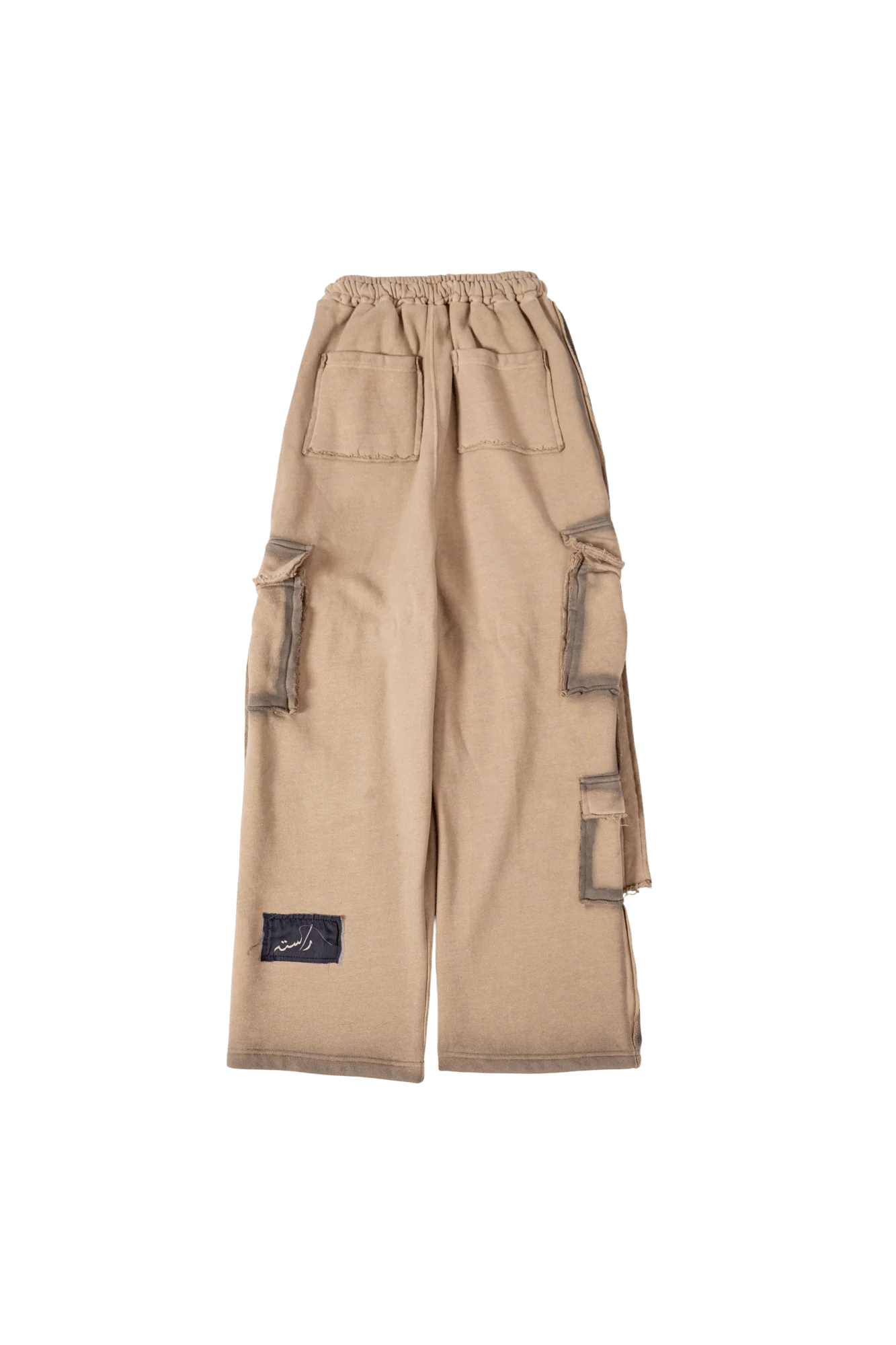 These fleece cargo pants fuse utility with experimental dyeing techniques. Featuring a relaxed wide-leg silhouette, multiple raw-edged cargo pockets, and hand-sprayed dye accents along seams and trims, each piece carries a unique finish. The Urdu calligraphy patch grounds the design in cultural identity, blending rugged utility with contemporary streetwear expression.