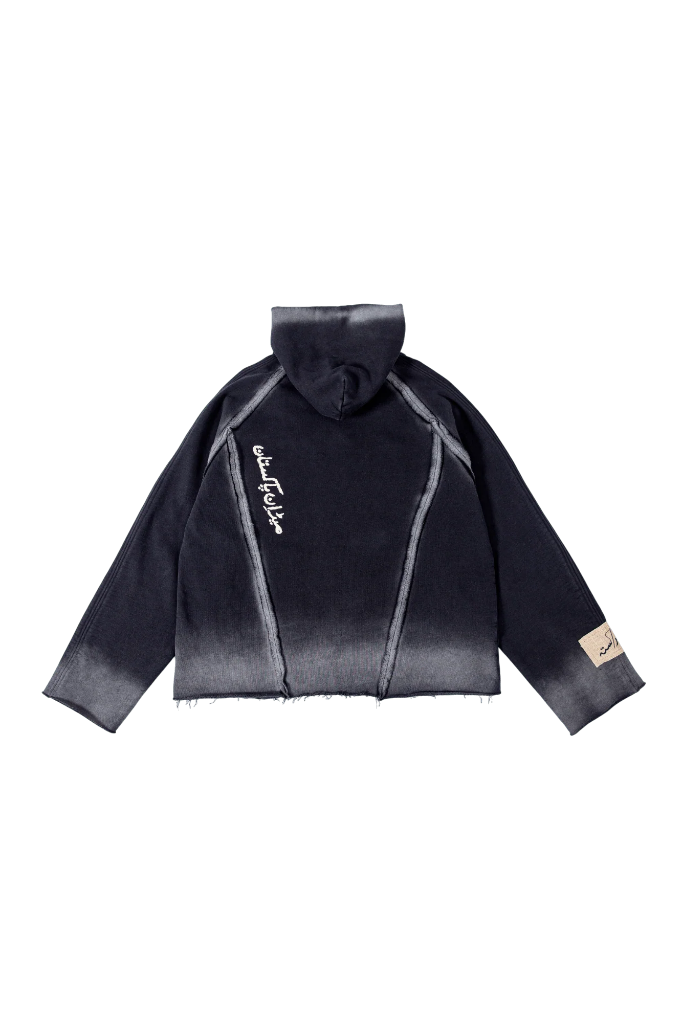 This hoodie is crafted from heavyweight cotton fleece, treated with hand-sprayed acid wash techniques for a textured gradient effect. Raw-edge seams and unfinished hems give it a distressed yet contemporary look. The front features a cluster of patched fabric logos, while the back carries bold hand screen-printed “Made in Pakistan” text, celebrating local craftsmanship. A statement piece blending rugged streetwear aesthetics with artisanal detail.
