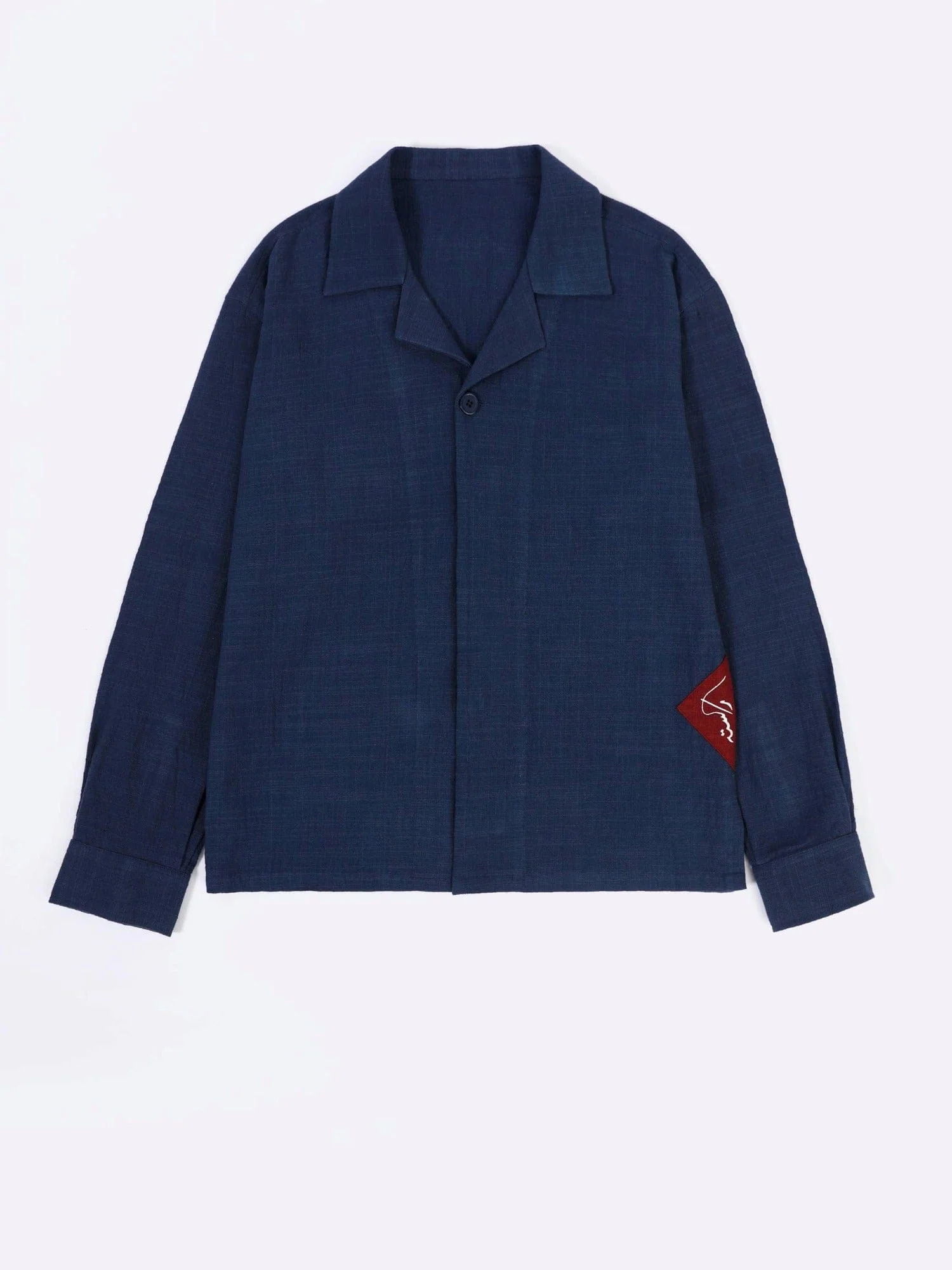 Made from handwoven khaddar, this full-sleeve shirt features a concealed button placket and a screen-printed logo patch in deep red khaddar for a striking yet refined contrast. The minimal silhouette and natural texture of the fabric merge tradition with contemporary polish, offering timeless versatility.