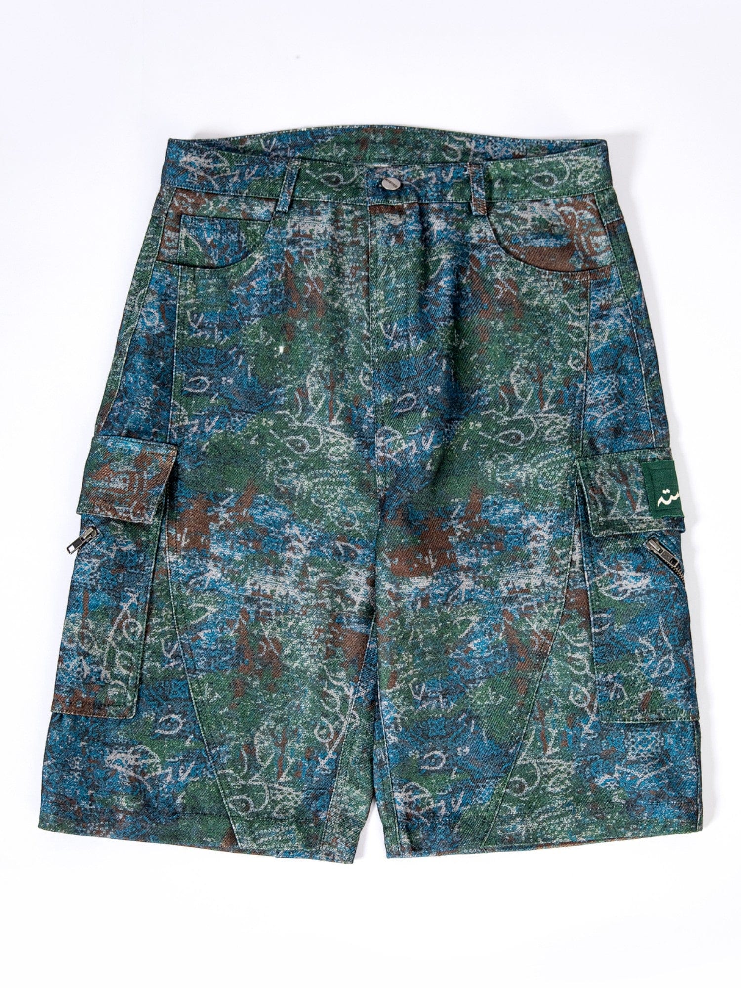 Constructed from printed polyester canvas, the shorts feature an all-over distressed-style pattern in earthy tones of green, blue, and rust. The panelled construction enhances form and structure, while side flap pockets and zip detailing balance functionality with visual depth. Finished with a screen-printed logo patch, this piece stands at the intersection of craft, culture, and contemporary design.