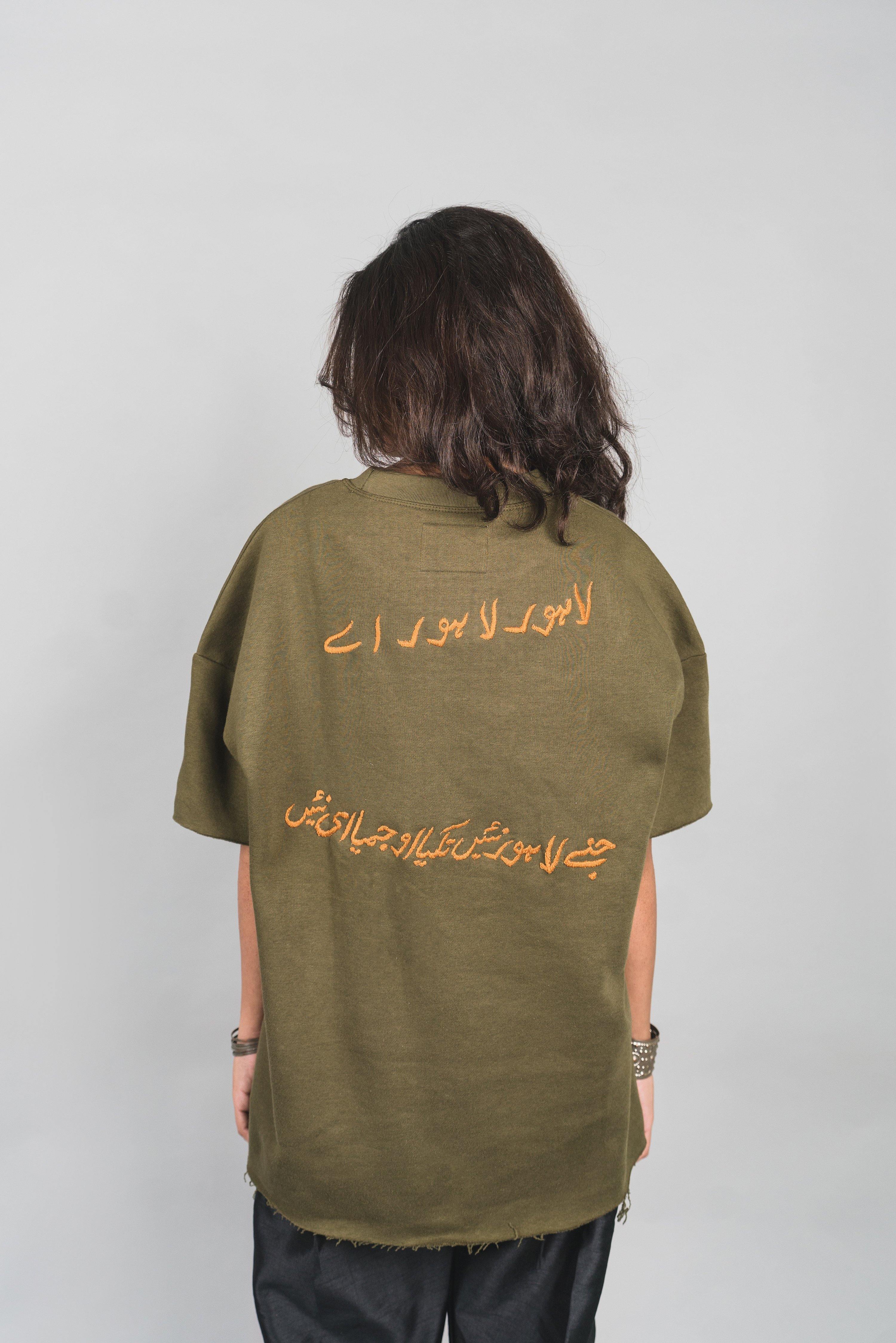 A juxtaposition of experimental design through dystopian thread work and a popular Urdu reference to the city of Lahore – “Lahore Lahore Ay”. The details on the front are all done by hand and the text on the back is hand machine embroidered. The t shirt is an ode to the iconic Pakistani song “Lahore Lahore Aye” by Tariq Tafu, which is now one of the most famous catch phrases within the city. Despite its chaotic elements and structure, the city remains one of the most vibrant and prominent jewels of South Asia. This piece encapsulates the spirit of harmony even amongst sheer chaos.