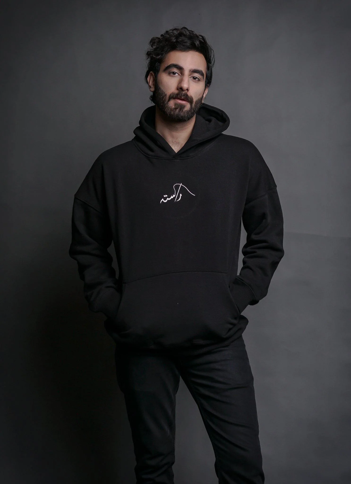 Limited edition hand crafted hoodie with "Rastah" embroidered on the front in Arabic script. Hand cut Kashmiri shawl patterns combined with a historic mughal princess painting to create motif featured on back. This piece features significant technical work completed graciously by one of our technical workers. The rose within each painting is individually hand embroidered, and the motif is printed on hand made fabric.