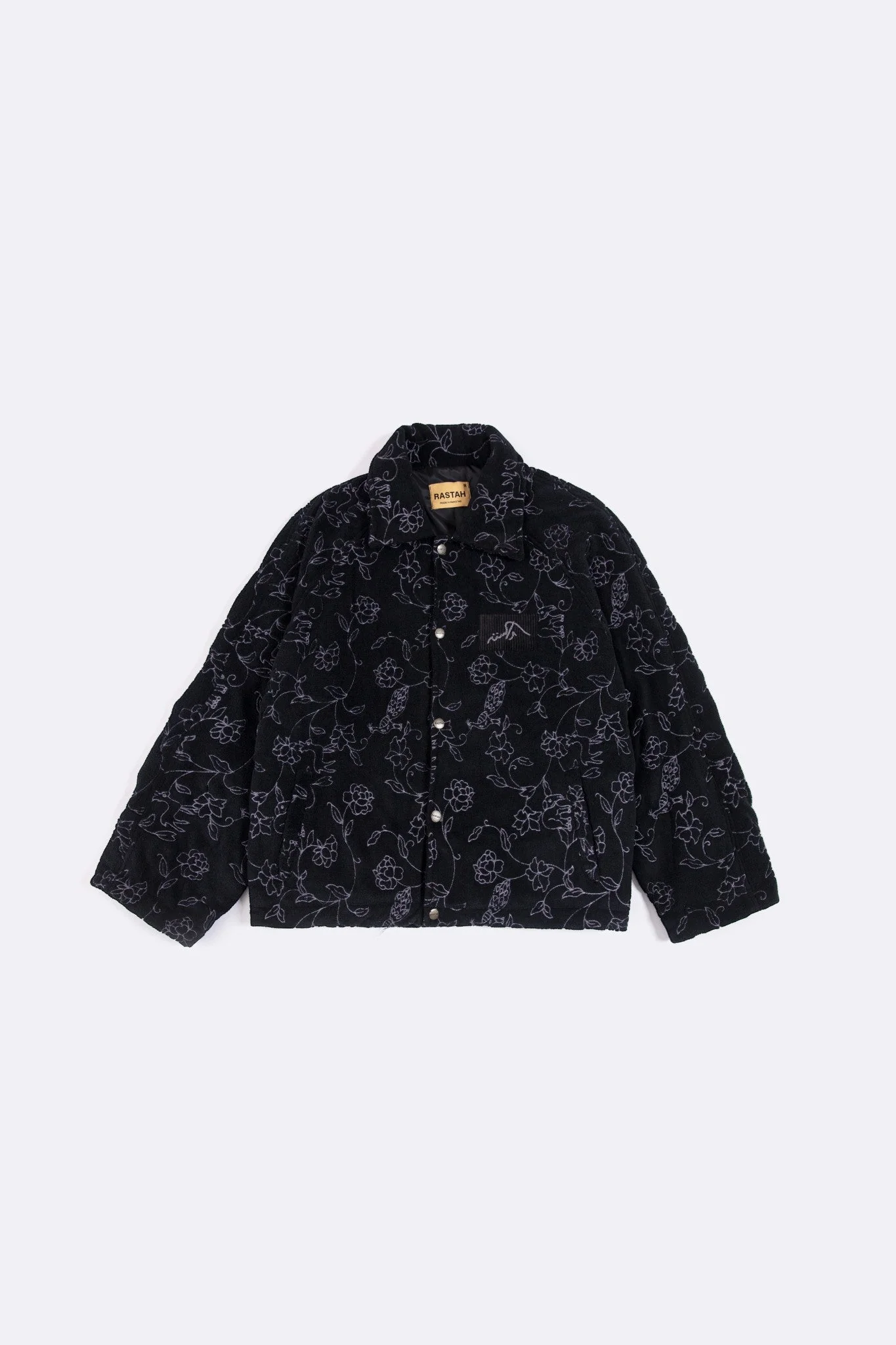 Flowers That Bloomed After Dark is a black sherpa jacket carrying a quiet garden within it. All-over embroidered floral patterns emerge softly from the dark surface, while a hand-embroidered logo patch adds a personal, human trace. Warm, tactile, and introspective