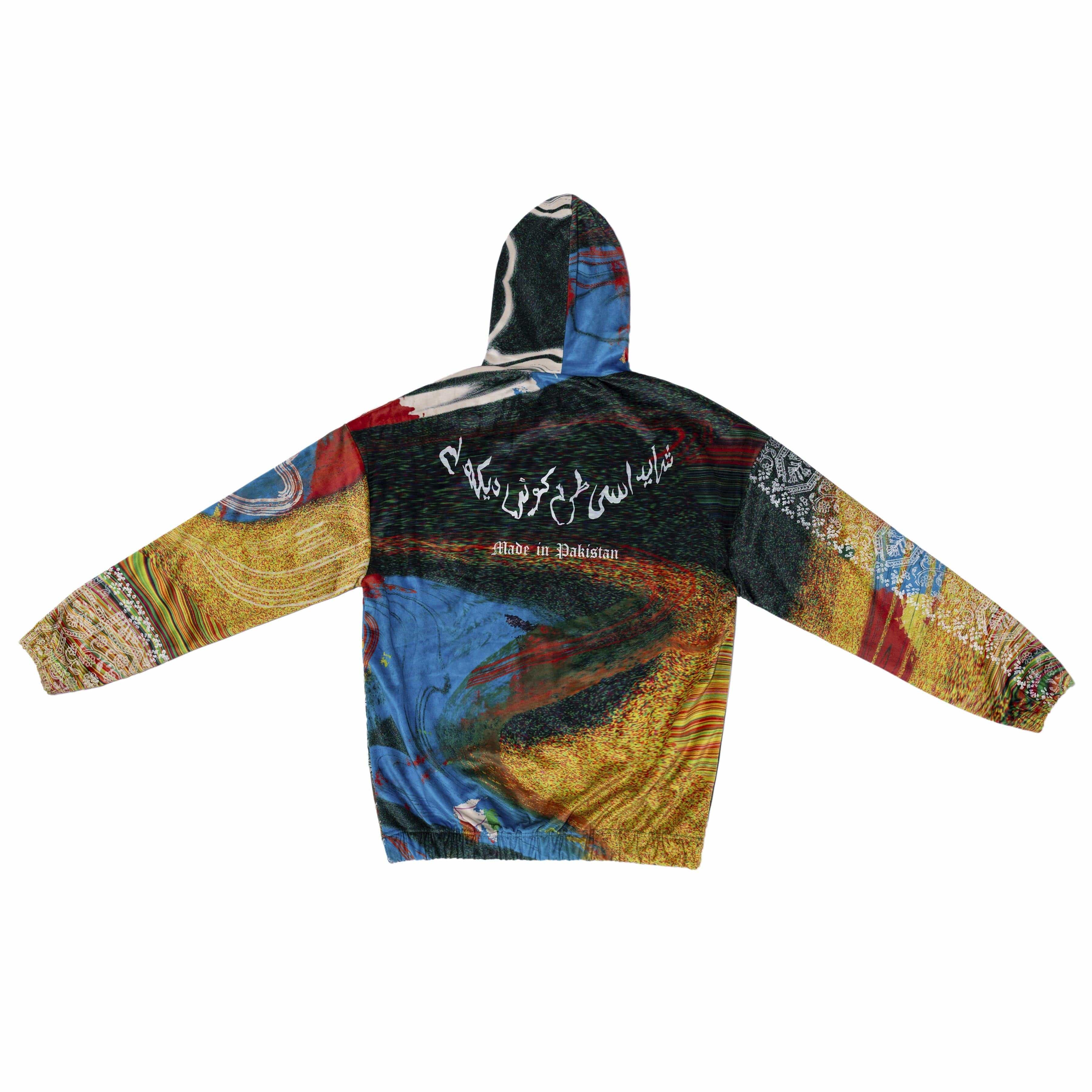 Perhaps one of VOLUME V's most iconic pieces, The hand printed velvet hoodie is a garment that exudes the the major thematic element of the collection - Feelings of youth exuberance and identity crisis. It is chaotic conversation of what we perceive our reality to be, and what those around us wish to project onto us. The velvet for this hoodie is first sublimation printed using an in-house designed print, and then hand block printed by Rastah's in house blockprinted - Aslam Mirza. The back of the hoodie has screen printed texted in Urdu, that translates to "Maybe someone will see me now" in English.