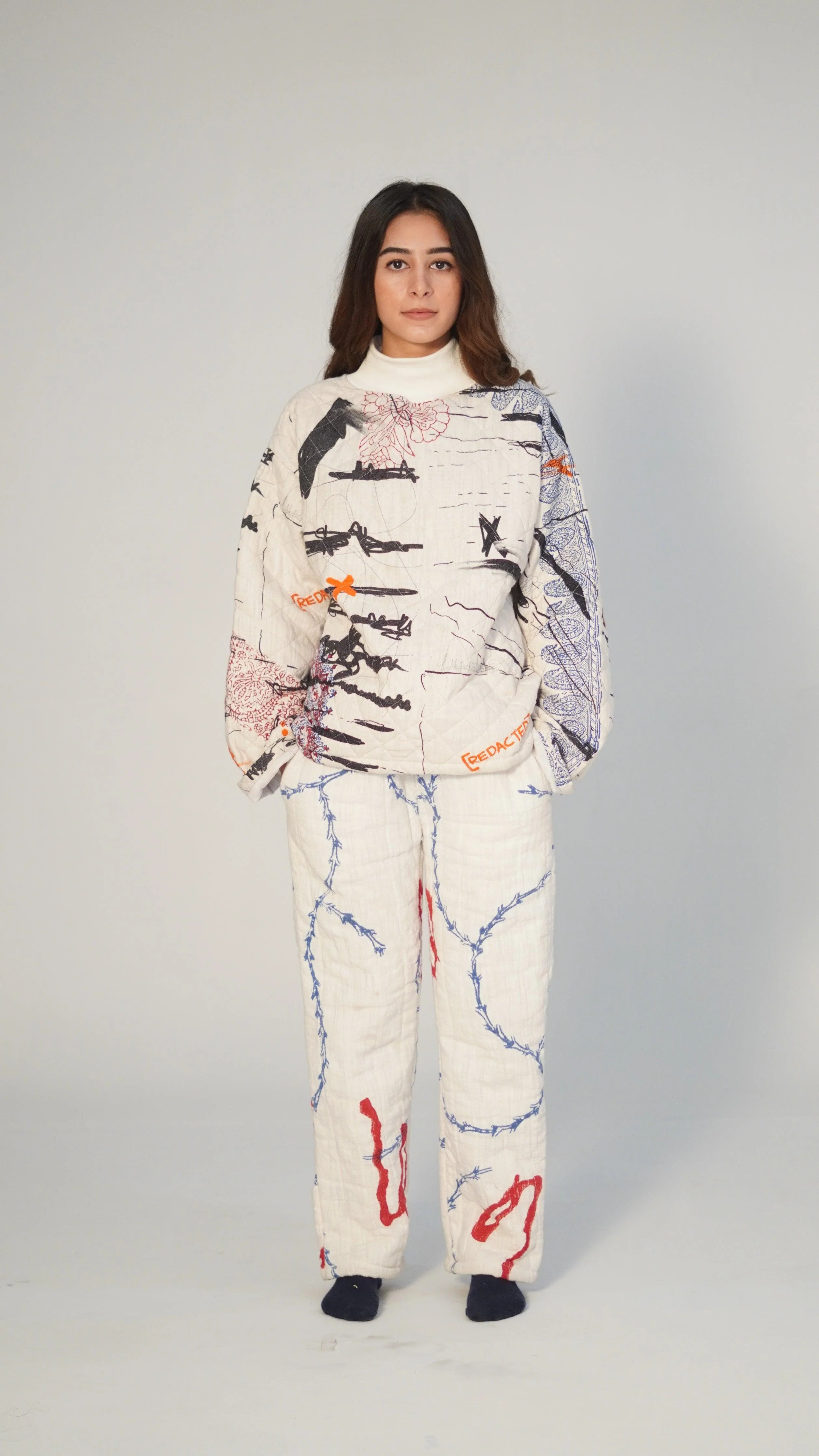 The print is a juxtaposition of redacted text, and traditional floral block printing. In the 1970’s and 1980’s Pakistani newspapers went through a phase of extreme censorship, and along with this, certain artistic styles were discouraged, and instead replaced with tradition Islamic art involving paisleys and florals.