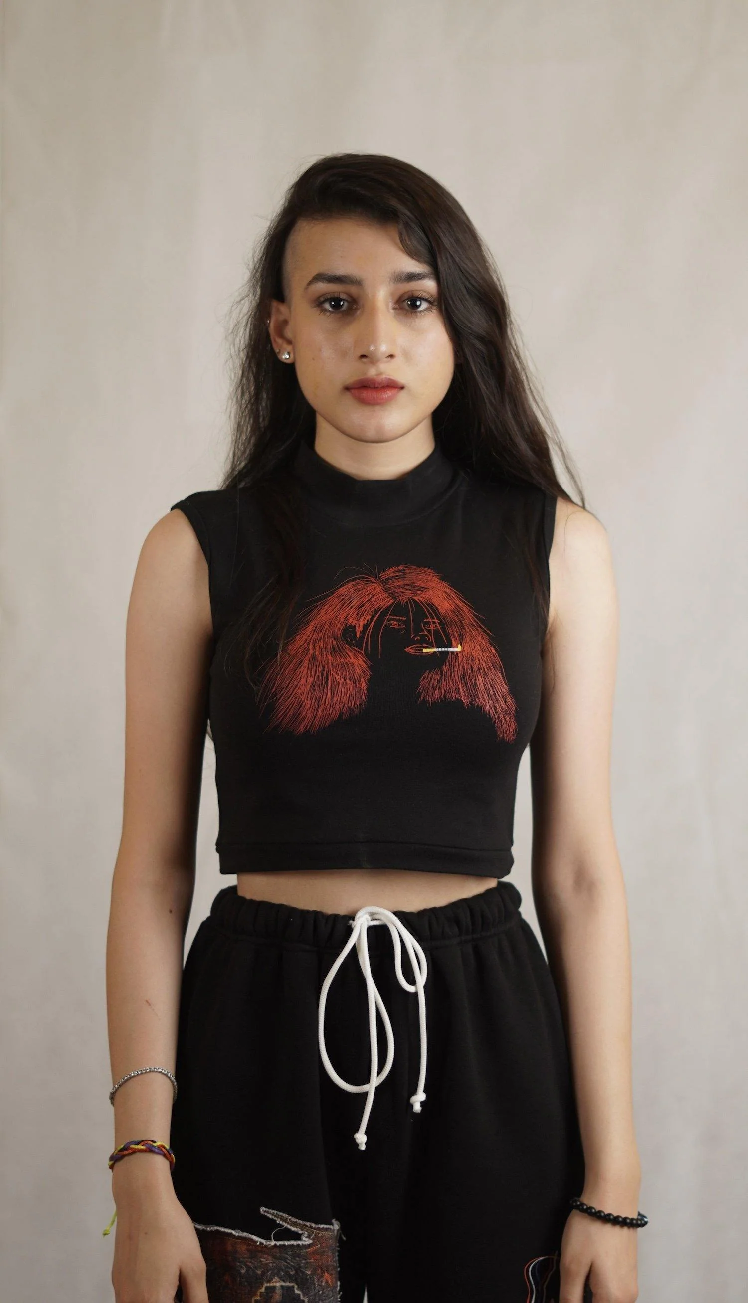 Mock neck crop top constructed from an elastic cotton/poly blend for added support and comfort. The top features an in house designed art piece showcasing a smoking woman hand screen printed on the front. Pair with Rastah's black sweatpants for the perfect evening summer look.